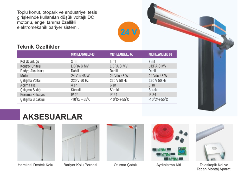 600 kilograma ve 7 metreye kadar kapıları desteklemektedir ve maksimum bu değerlerde kapılar için kusursuz bir performans sunar. Buton, kart okuyucu, manyetik dedektör, Wifi veya GSM modülü gibi ihtiyaca göre şekillenen kontrol yöntemleri sunabilir. Tüm bu çalıştırma olanaklarını destekleyen esnek kontrol kartı yapısı sayesinde her türlü ihtiyaca cevap verebilmektedir. BFT ekosistemi modülleri ile de geliştirilmeye müsaittir.